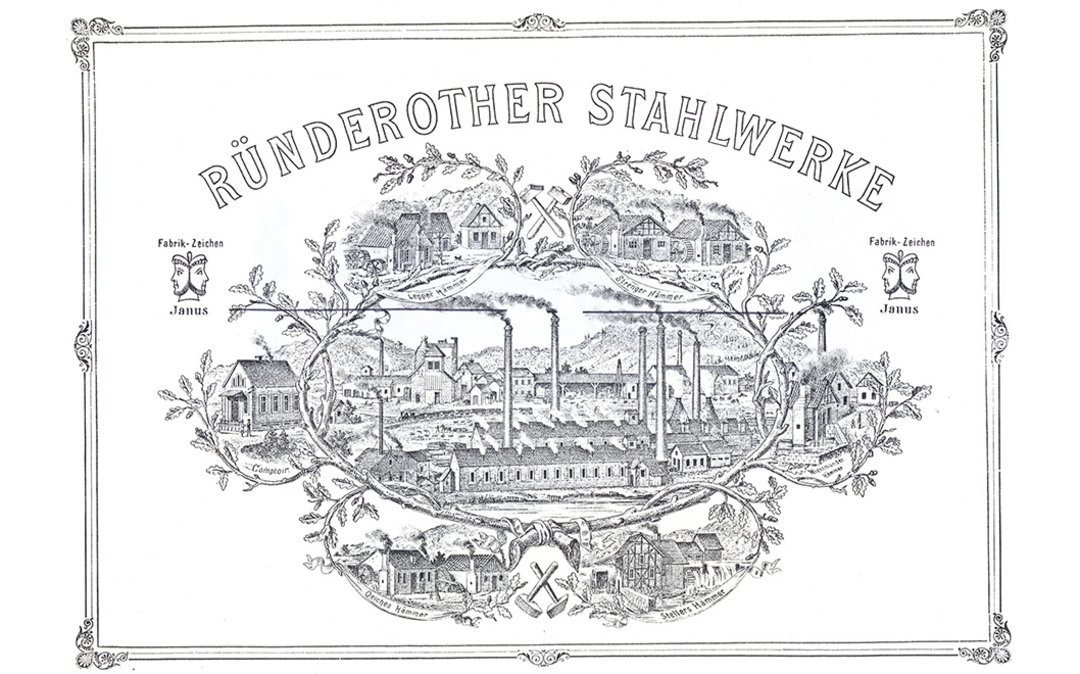 Die Firma "Eduard Dörrenbergs Söhne" wurde 1860 von Friedrich, Rudolph und Eduard Dörrenberg gegründet. Durch den Erwerb des Ründerother Hammers etablierte sich das Unternehmen als Hersteller hochwertigen Raffinierstahls und entwickelte 1875 den Edelstahl Janus, der den Grundstein für das heutige Dörrenberg Logo legte. In den darauffolgenden Jahren setzte Dörrenberg auf technische Innovationen und erweiterte seine Geschäftsbereiche, wie die Einführung von Beschichtungsverfahren und die Gründung neuer Unternehmenszweige.